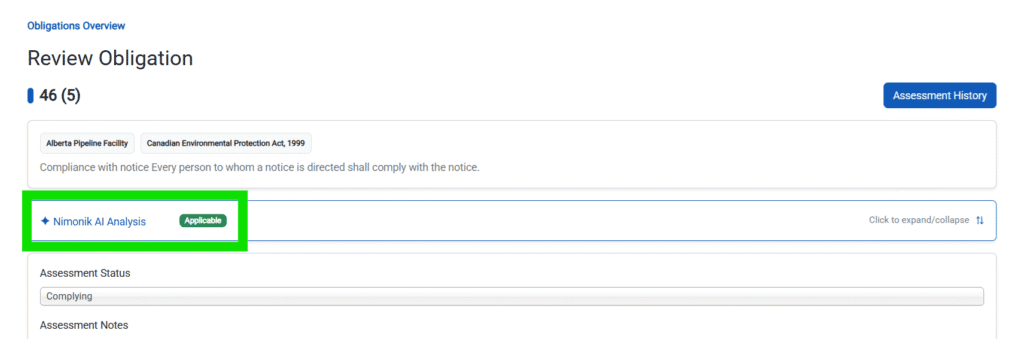 L’analyse IA de Nimonik est basé sur le profil de votre installation. Ces profils d’installation comprennent l’emplacement, les principales réglementations applicables et une description des activités afin de déterminer si une obligation s’applique, peut s’appliquer ou ne s’applique pas à cette installation. L’analyse IA communique la justification de chaque évaluation. Au final, cela aide les utilisateurs à comprendre comment agir sur la base de ces informations. Outil dynamique, l’analyse IA adapte de plus en plus les évaluations à mesure que les utilisateurs modifient les profils de leurs installations et ajoutent des informations supplémentaires. Cette fonctionnalité est actuellement en mode bêta et sera bientôt disponible.