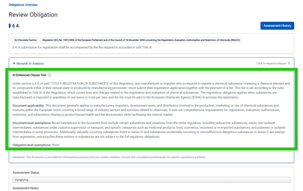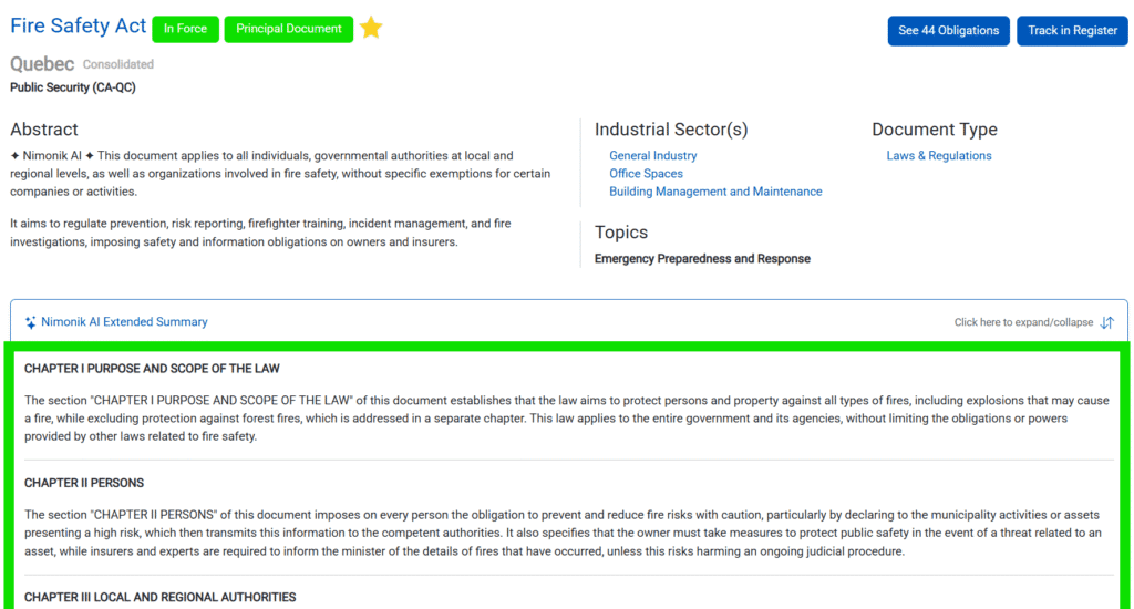 Le texte des clauses amélioré par l’IA de Nimonik complète les obligations avec un contexte essentiel pour comprendre rapidement les exigences sans avoir à lire l’intégralité du document. Chaque texte de clause amélioré par l’IA développe la clause originale en incluant l’applicabilité générale du document et les exemptions afin d’aider à identifier les clauses pertinentes pour votre organisation.